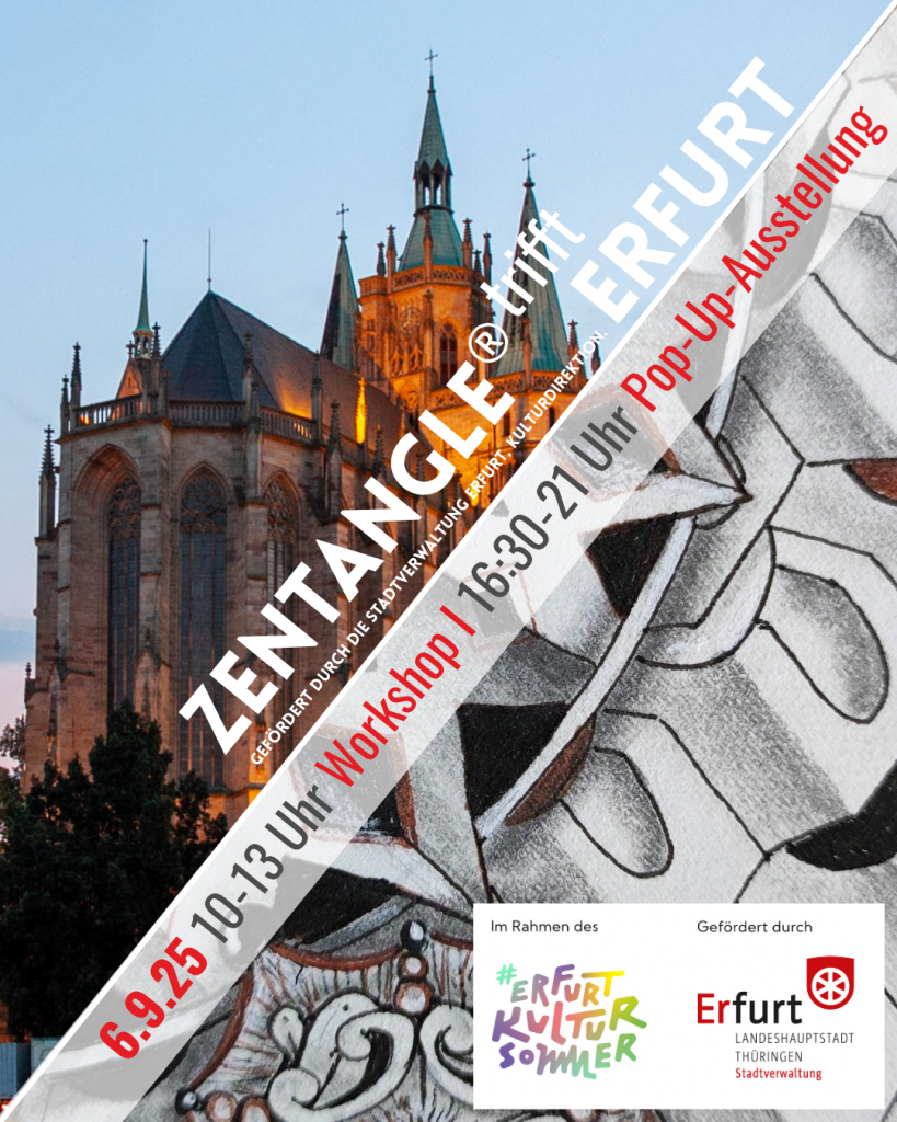 Ein Zentangle®-Workshop mit den neu entwickelten „Erfurter“ Mustern. Die gute Nachricht: Man muss nicht zeichnen können! Wer die Buchstaben I, S, C und O schreiben kann, kann auch Zentangle zeichnen – Schritt für Schritt zeige ich den Weg zum eigenen kleinen Kunstwerk. Jedoch ist es von Vorteil bereits erste Erfahrungen mit der Zentangle-Methode gemacht zu haben.